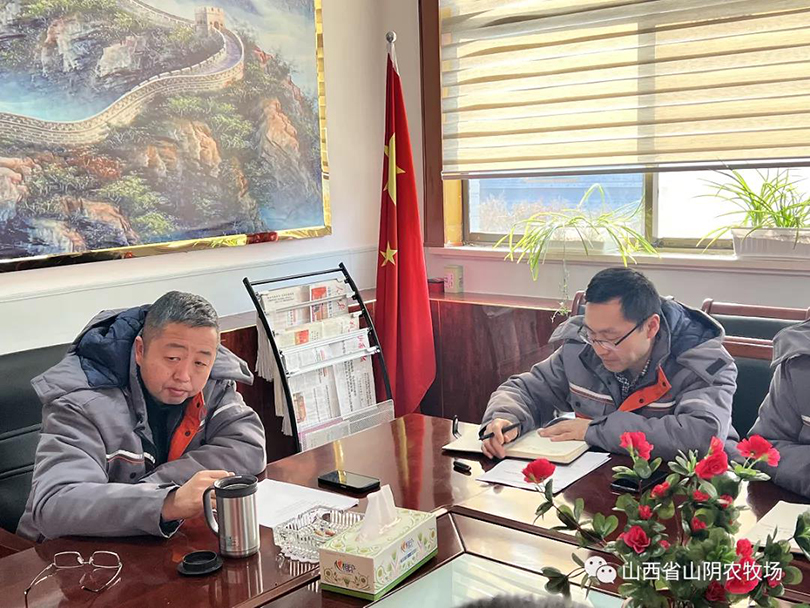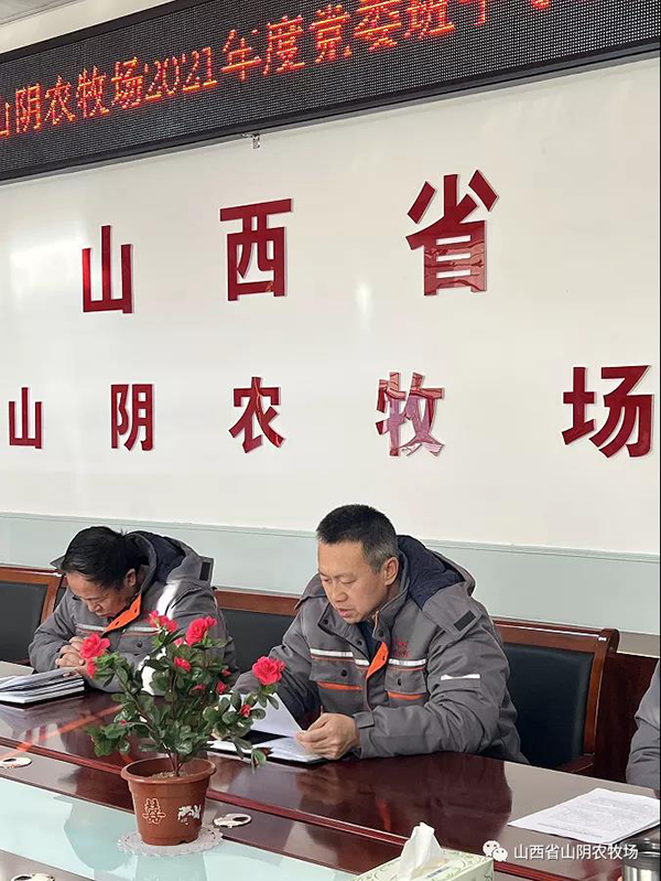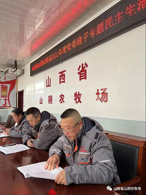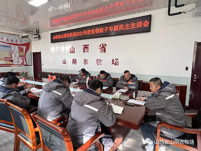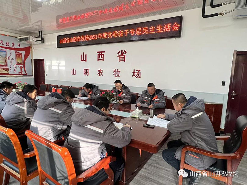 2022年1月25日,山西省山阴农牧场党委.班子召开2021年度党委.干部党史学习教育专题民主生活会。会议由场党委书记、场长冯成義主持,党委副书记王永卿,纪委书记蒋志平,党委委员、副场长张汉斌,党委委员、副场长周文来参加会议,场长助理杨艮,纪委副书记、机关党支部书记黄春生,党政综合办公室主任李樑列席会议。