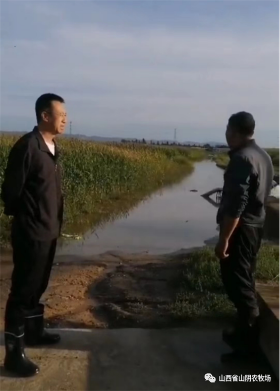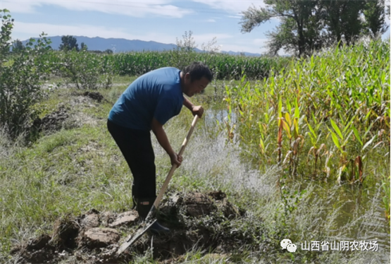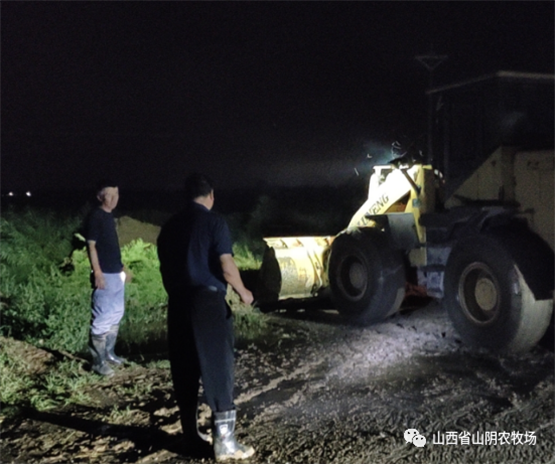 山西省山阴农牧场全体干部职工发扬不怕苦、不怕累、不怕脏、奋勇向前的精神,以场为家,群策群力,全员战斗在抗灾.,全力以赴,勠力同心,克服困难,与雨灾抗战,.我场平安减灾。