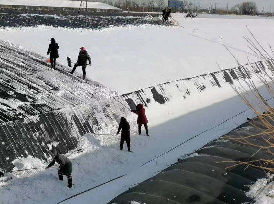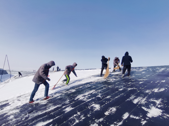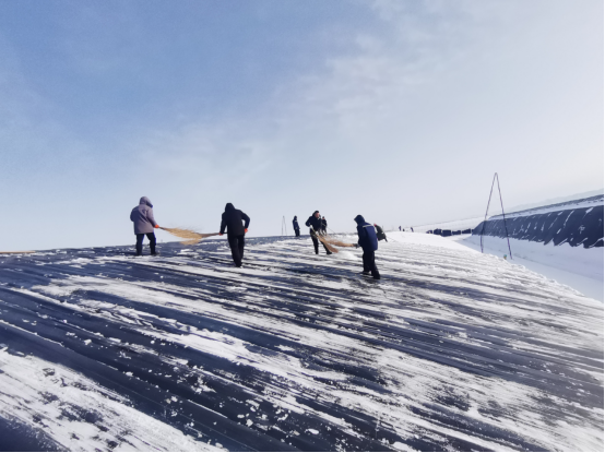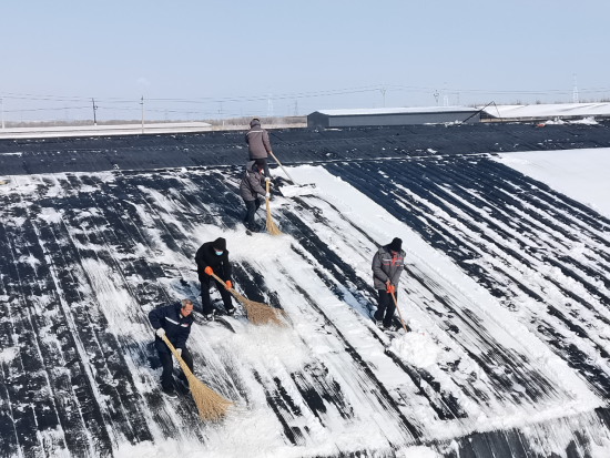 经过一整天的奋战,积雪被清理得干干净净,积雪清除后,及时卷起棉被,使棚内能够尽早升温、排湿气,确.保蔬菜正常生长,现代农业科技研究院的生产运营正常进行。